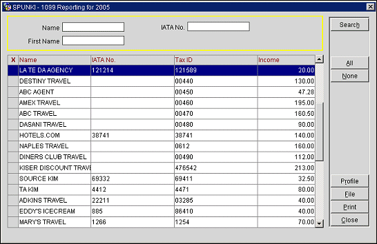 Note: If entries appear without a Tax ID, you will receive an error message when you prepare the 1099 report using the File or Test File buttons. If a record does not include a Tax ID, you may highlight the record and select the Profile button to go to the Profile screen where you may enter the individual or account's taxpayer identification in the Tax ID field. (This field must be screen painted on the Profile screen.)