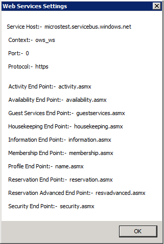 Make a note of these values. These are the Web Service Settings that need to be entered in the webHotel Site Manager, under System Tools > Web Service Settings. See Also: The Web Service Settings help Topic in the webHotel Help for more information.