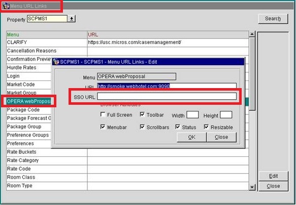 The webProposal feature is available in OPERA Sales and Catering and PMS. For Web Service Configuration in OPERA go to configure the OPERA S&C webProposal link under URL Setup. To access this in OPERA > go to Configuration > Setup > Menu URL Setup > S&C webProposal and define the OPERA SSO (Single Sign On) URL.