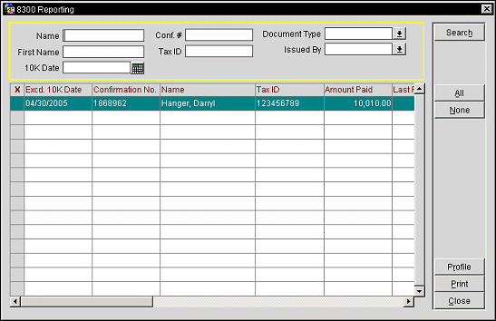 Note: If entries appear without a Tax ID, you will receive an error message when you prepare the 8300 report using the File or Test File buttons. If a record does not include a Tax ID, you may highlight the record and select the Profile button to go to the Profile screen where you may enter the individual or account's taxpayer identification in the Tax ID field. (This field must be screen painted on the Profile screen.)
