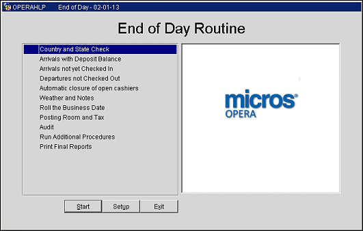 As OPERA has its own system date, it is not automatically changed at midnight but after finishing the End of Day sequence. Therefore, it is possible to run the End of Day sequence the next morning. In this case however, it must be considered that all revenues and payments which are posted before the End of Day sequence statistically belong to the old date. Also, fixed charges have not yet been posted. If there are check-outs before the End of Day sequence, advance folios must be printed.