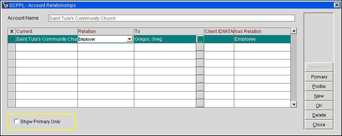 To view the profile identified in the Company Name column (that is, the profile which the current profile shares the relationship), highlight the relationship record and select the Display button. You may also double-click on the name in the Company Name field.