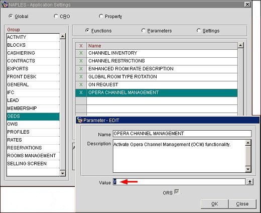 To activate the OCM functionality, select ORS>Setup>Application Settings to access the Application Settings screen. Select the Global radio button and then the OEDS Group. Then, select the Functions radio button, and set the OPERA Channel Management application function to Y. The OCM functionality is active.