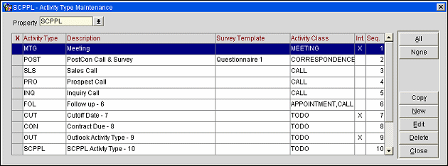 Copy. Copy the highlighted Activity Type to create a new Activity Type for another property. You may also place an X in the X column to mark an Activity Type for copying. Use the All or None buttons to select all activity types or to de-select all activity types. You will be prompted to select the property to copy the selected Activity Types to.