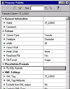 Rename it to CF_LOGO or any other name you choose. Set the Datatype a Character. Change the Read from File to Yes. Set the File Format as Image. Point to the PL/SQL Formula and click on the field. |