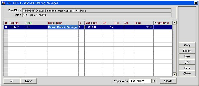Click OK to attach the package to the current Business Block. Once this has been done the Attached Catering Packages screen appears, listing all packages that are attached to the Business Block.