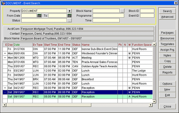 Note: Catering Events, Packages and Templates cannot be created from the Master Allocation or Master Block, however they can be created for a Sub-Allocation/Block. When selecting the Events button from the Master Allocation/Block, the Event Search screen will display either a list of events already existing for a Sub-Allocation/Block of the selected Master or a message prompting you to choose a Sub-Allocation/Block of the selected Master to for which to create an Event.