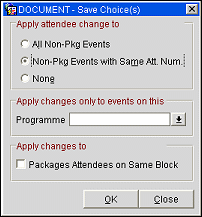 From here it is possible to change package specifications such as the number of attendees to adjust the package pricing accordingly. Enter the new number of attendees in the Attendees field and click the OK or Save button to apply the changes. Before the changes are applied the Save Choices screen appears asking you to confirm the changes. Attendee changes can be applied to All Non-Pkg Events, Non-Package Events with the Same Attendees Number, A specific Programme or Package Attendees on the Same Block. Make the appropriate selection then click OK.