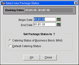 If the package is configured to last for several days with a different program for each day, the Business Block date range must at least be the length of the configured package days. This type of package will only be applied once, even if is covers less days than are included in the Business Block date range. On the same screen, also select the Package Status of the Package to be attached to the Event. This can either be the Catering Status of Business Block or Default Catering Status.