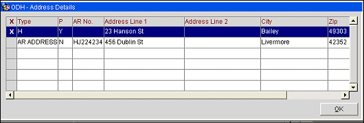 The screen shows all the addresses associated with the guest identified in the Name field on the Routing Instructions screen. To choose an address as the billing address, highlight the address and press the spacebar, or you may click in the X column. An X appears in the X column of the address you have chosen. Select the OK button. You may choose only one address.