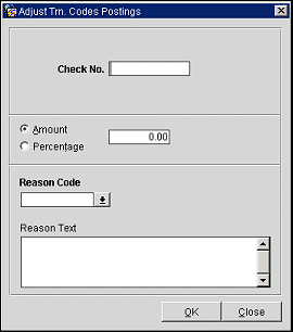 To adjust all the guest's transactions having a specific check number, select the Adjust by Check No. radio button on the Adjustments screen. Select OK to display the Adjust Transaction Codes Postings screen.