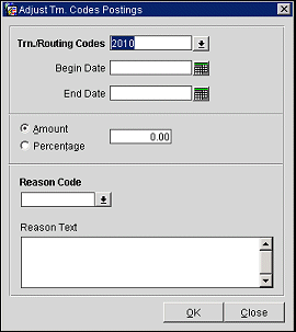 Note: Adjustment by routing code is available when the Cashiering>Routing application function is set to Y. See Routing Codes for details.