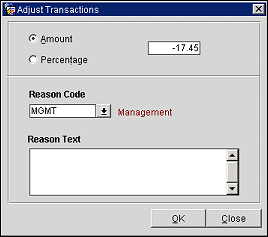 Amount/Percentage. Select the Amount radio button to adjust the all selected transactions by the same fixed amount. Select the Percentage radio button to adjust all selected transactions by the same fixed percentage.