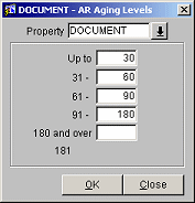Select Configuration>AR>Aging Levels to set the AR aging levels for your property. OPERA allows you to define the aging periods most suited to your operation. In these fields you define the ending number of days and OPERA calculates the beginning number. For example, if you enter 30 in the first field, aging period one (current) is 0 - 30 days. OPERA calculates that aging period two begins at day 31 and asks you to supply the end day for that period (e.g., 60). OPERA calculates the beginning of aging period three as day 61 and asks for the end of this aging period; and so on. This pattern continues until you have filled out all five fields. The last field is automatically calculated as everything over the last number you entered.
