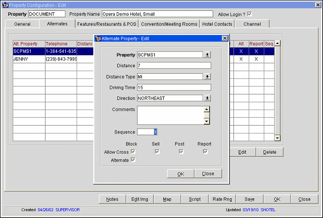 Alternate. Check this box to ensure that the property is listed as an alternate property. If you check this box you must also check the Sell box. However OPERA will Allow Cross Sell even with the Alternate check box unchecked. By marking this alternate property as an Alternate via this check box, the property will be displayed within the Cross Reservation Sell screen when the queried property (the one you are currently editing) is not available.