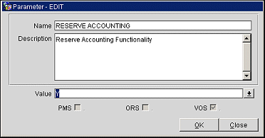 The Parameter - Edit screen shows the name of the function, parameter, or setting, its description, and check boxes that indicate the OPERA applications that use the feature.