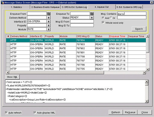 Example:  OXI-OPERA interface Aqueue Out screen.