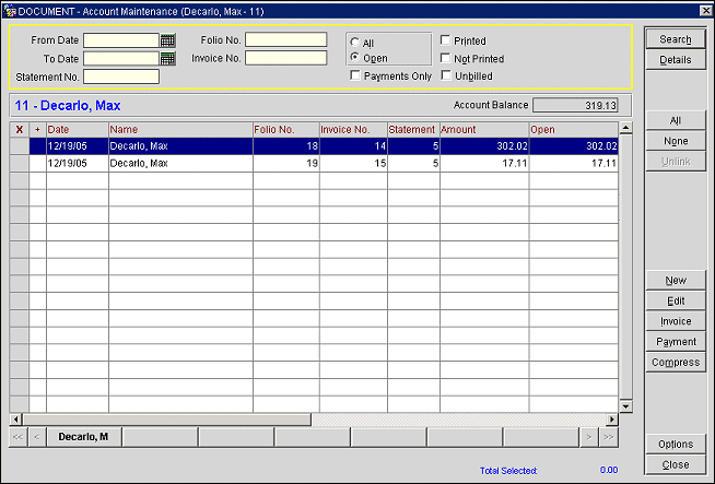 Mark an X in the X column to choose the invoices to apply those functions to that apply to multiple invoices (such as Compress and Unlink). You may use the All and None buttons to select all invoices or to un-select all invoices.