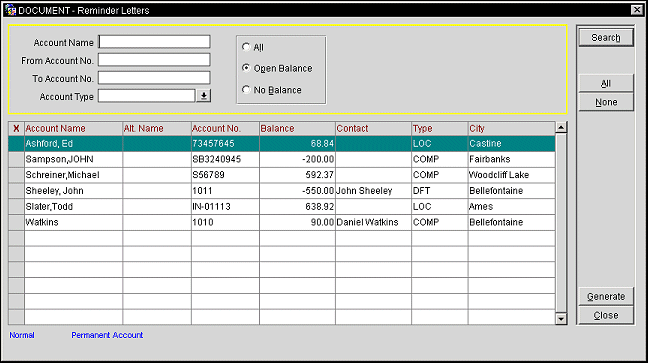 Using the search results grid, select the account or accounts to generate reminder letters by placing an X in the X column. Click in the X column to select the account. Or you may select the account by highlighting it and selecting the spacebar. If you are choosing only one account for the function, you may simply highlight the account without placing an X in this column. When you have selected the account or accounts to generate reminder letters, select the Generate button.