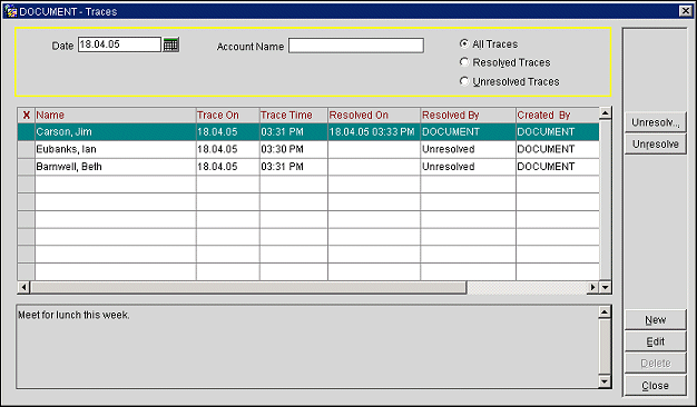 The grid portion of the Traces screen displays a list of the traces for the account or accounts you selected. The text box below the grid displays the full text of the trace highlighted in the grid. Search criteria allow you to filter the display based on the action date and whether the traces are resolved or unresolved.