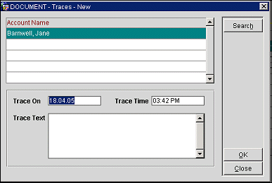 If the Traces screen is accessed from the AR>Traces menu bar option, all AR traces for all AR accounts are displayed. If the screen is accessed via any of the other methods, only the traces for the selected account are displayed.