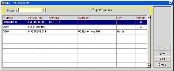 Primary. An X is displayed if this is the primary AR account. A profile can have multiple AR accounts at the same property. One AR account may be designated as the primary account for each property. The primary AR account will be used as a "default," for example, when the profile has multiple AR accounts and an AR account is listed in screen displays or in a report.