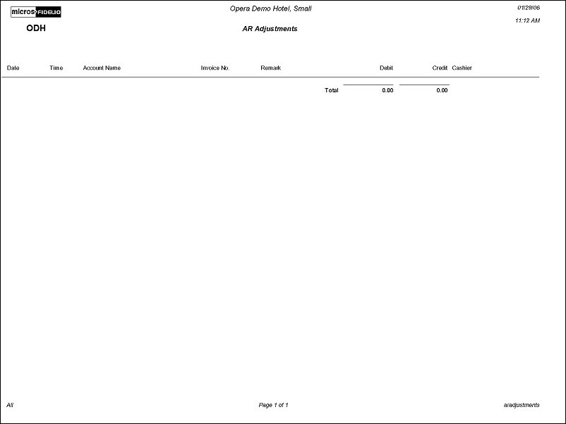 The AR Posting Adjustments Report displays adjustments that have been made to a posting from a previous business date (that is, posted and audited). Adjustments involve reversal of the original transaction (or group of transactions) and re-posting of the correct transaction(s). Adjustments may be made to a single transaction or to multiple related transactions. Print this report to verify adjustment discrepancies or as an audit on the cashier responsible for the posting. Displays Posting Date, Time, Room Number, Name, Description, Remarks, Revenue Date, Cashier, Debit, Credit.
