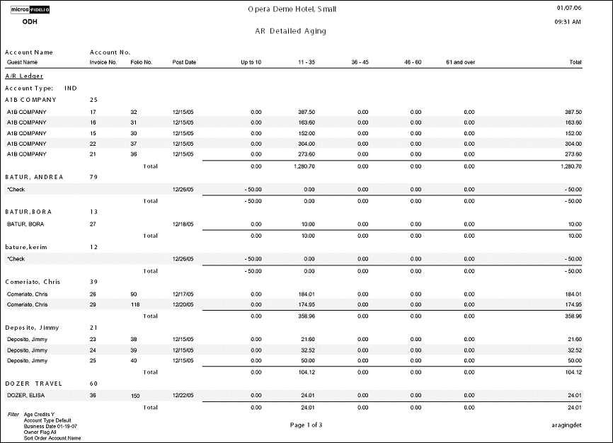 The AR Detailed Aging report displays all account invoice details per AR Account. This report lists each Invoice, transaction or folio that contributes to the current balance of each individual AR account. The information displays the invoice balance for each line item in the appropriate aging level. The output is divided into two sections, the AR ledger and Accruals.