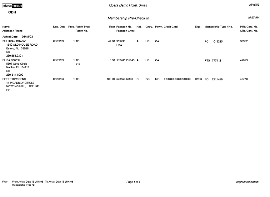 The Membership Pre-Check In Report will display those Reservations not yet checked in, and have active Membership attached to the Reservation. Only the Primary Address and Phone Number will be displayed.