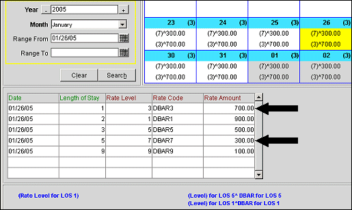 Calendar. The calendar summarizes the inventory statistics for each day. Data values are separated by ^ and parenthesis. (See example below for when Dynamic BAR has been selected for the Search Type, along with the Length of Stay of 5.) The Rate Level for the LOS of 1 is (3) and is indicated in parenthesis next to the date on the calendar. For the length of stay of 5, the rate level is (7), as indicated in parenthesis in the calendar date block on the top line. The DBAR rate follows the ^ symbol and in this example is $300.00. Users can compare the first line: containing the requested search of LOS for 5 days, (rate level) and ^rate amount with the second line: LOS for one day (rate level) and ^rate amount, which in this example is $700.00.