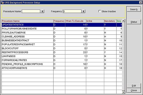 Use the Background Processor Setup screen to schedule OPERA processes so that they run automatically in the background at a time when system resources are most available or according to your business needs. These processes help ensure your OPERA system performs at maximum efficiency by cleaning up the database and other tasks. You can schedule these processes to run during non-peak hours so that system resources are free for your critical daily operations. To determine when the last time the process was run and the results, select the Status button.
