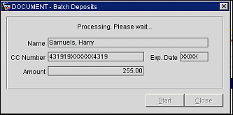 The Batch Deposits screen appears when you select the Payment button to perform batch deposit authorization processing from the Deposit screen. (To perform batch deposit processing, at least two deposits having a credit card payment method must be selected on the Deposit screen.) This screen dynamically displays information for each credit card as deposit authorization is processed through the interface. Select the Start button to begin batch processing.