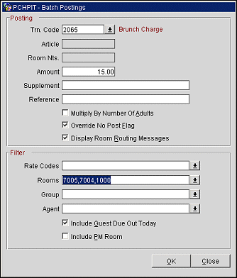 Display Room Routing Messages. Select the check box to display the room routing message, "Room Number, Guest Name. There are routing instructions for this transaction code. Transfer this posting to Room Number, Guest Name?", should the transaction code selected for the batch posting be included as a Routed Transaction for a reservation that is included in the batch posting. If the message is selected to be displayed, select Yes to complete the batch posting, or No to return to the Batch Posting screen with no postings made. If this check box is not selected, then the Routed posting will automatically be completed, without the message prompt, upon selecting the OK button for the Batch Posting.