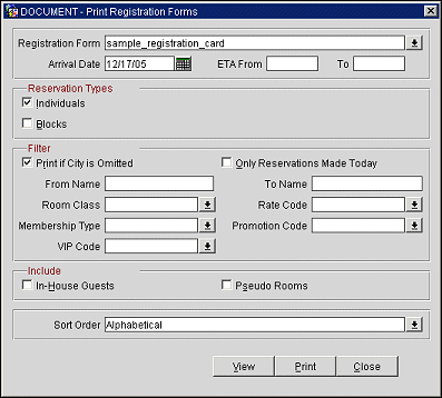 Enter appropriate filter criteria to identify the guests to print registration cards. When you are done, select the Print button to print copies of the registration cards on the local printer. Select the View button to launch the Adobe Acrobat Reader and display a PDF version of the registration card on-screen. If you like, you may use the Print feature on the Adobe Acrobat Reader screen to print the PDF after reviewing it.