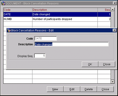 Code. Enter the code that will identify the reason for the cancellation. (When editing an existing block cancellation reason, you may not modify the code.)