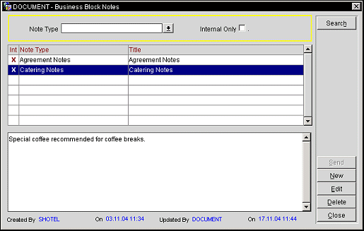 Use this screen to add New notes, Delete existing notes, or Edit any special notes pertaining to this Business Block booking. Once you have attached notes to the booking, a Notes lamp appears in the lower part of the booking screen (See Indicator Lamps for complete list and details).