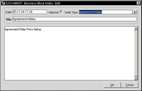 The Title field is a free typing field and is used to allow the user to make this note more specific. The text entry section is a free typing area where you can note all the information required. Alpha-numerics are accepted. Select OK to save these changes, or Close if you don't want to save these changes.