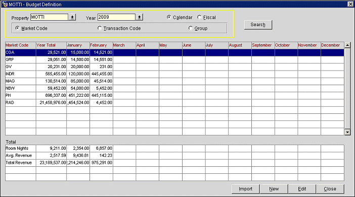 When the Market Code or Transaction Code radio buttons are selected, you see a calendar or fiscal period breakout of revenue, per code, in the upper grid. The lower grid shows total Room Nights, Average Rate, and total Room Revenue for the year and for each period during the year.