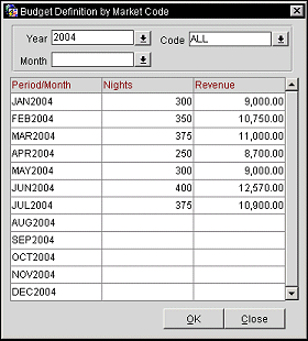The Budget Definition by Group Code screen appears. Select the Year, Month/Period, and Code in the drop down fields and then select either the Rooms or Catering radio button at the bottom of the screen (for either Room Revenue or Catering Revenue Types). For Rooms, enter Nights and Revenue values per month/period directly into the grid. For Catering, enter Revenue per period. Select OK to save your changes.