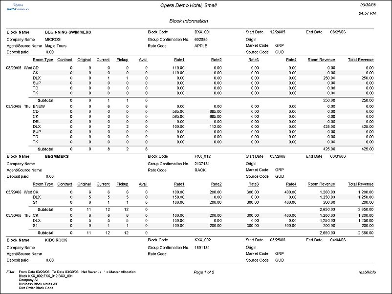 Blocks. Multi Select LOV to select specific blocks to filter by and display in the results of the report. When the application function Blocks>Master Sub Allocations is active, the Master and Sub-Allocations will be indicated in the Block Header Information. Additionally, the Current column will display the available inventory for the Master Allocation and Pickup column will always display 0 rooms.