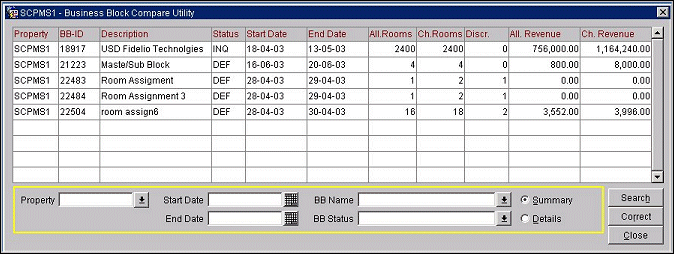 For any one or more selected business blocks, the Business Block Compare utility compares the number of rooms allotted and room allotment revenue figures shown on the business block room grid with the same information computed from the total activity recorded in the change log. Business blocks for which a mismatch exists are displayed in the Business Block Compare Utility grid. In the event of a discrepancy, you may use the utility to correct the change log so that the values on the business block room grid and change log agree.