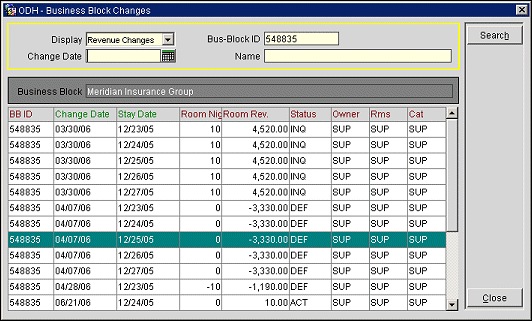 Select Reservations>Blocks>Business Block>Options>Prod. Changes to display a view only Search screen that will take you to the revenue and status changes screens. This option is available only if the Sales & Catering (OPS<version> number>) license is active.