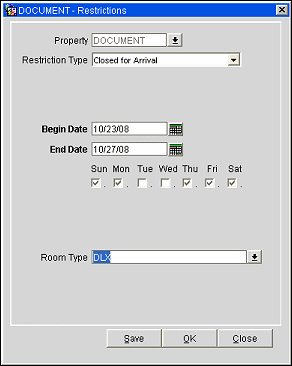 Restriction Type. Select the down arrow to choose the restriction type you wish to apply. Please see Rate Availability(F5) for the restrictions type list of values and their descriptions.