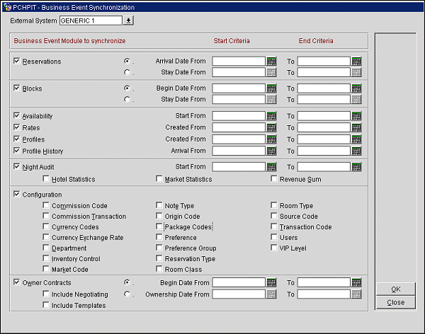 You may use the Utilities>Synchronize Utilities>Business Event Synchronization function if the license code is activated for OPP_BSEV Business Events and the appropriate external system (yield management, etc.). Business Event Synchronization provides you with the ability to capture or re-capture past business event data and has been implemented for upload to third parties.