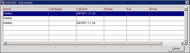 The Call History screen is displayed when you select the Call History button from the Reservation Options menu and from the ORS Reservation Snapshot screen.