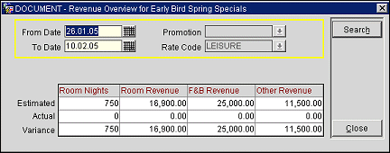 Enter search options and select the Search button to display the revenue statistics associated with the campaign rate code or promotion code.