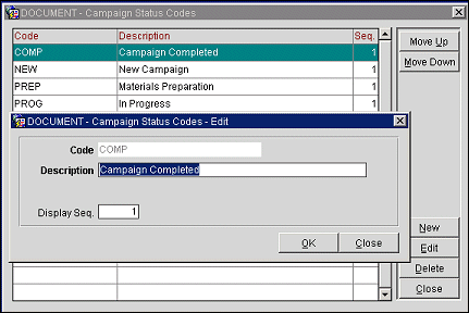 Display Sequence. Number that controls the position of the code in listings. Codes having the same sequence are listed in alphabetical order. Codes without a sequence number appear in alphabetical order following codes that have a sequence number assigned to them. You may also use the Move Up/Move Down buttons on the Campaign Status Codes screen to change the sequence of status codes.