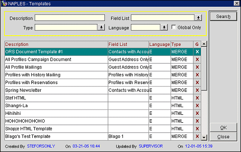 Use the search options to find existing document templates you are interested in. Enter your options and select the Search button. For more information on Document Templates, see Document Templates. To add a document template, highlight the document template on the Templates screen you want associated with this Campaign Type and select the OK button.