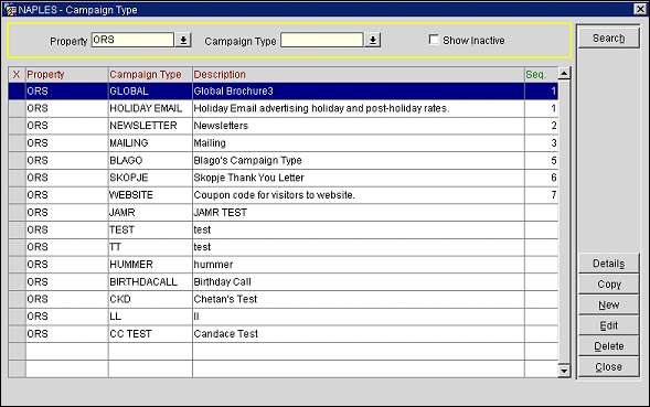 Copy. Use this button to copy the highlighted and selected (X) campaign types to other properties. The Property List screen appears where you can select the property(s) where you want to copy the campaign types.