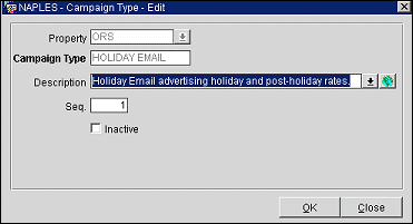Property. The property LOV displays when the ORS (OPR>version number>ORS license code) or OPP_MHOT Multi-property PMS code is active. Select the property whose campaign types you want to view, or for ORS, you may select the entire ORS database.